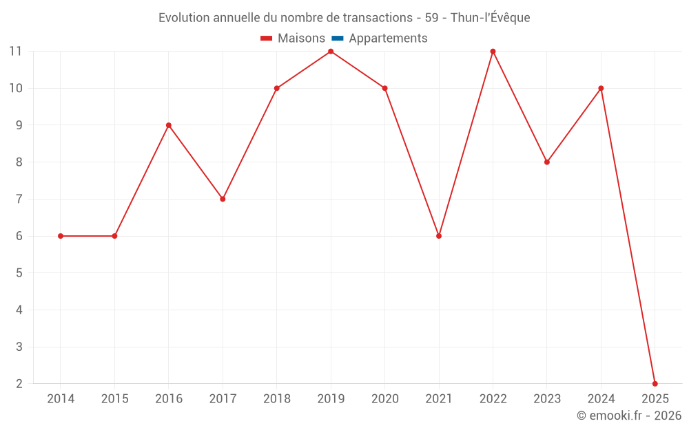 Le prix médian sur les 19 transactions de maisons des 24 derniers mois dans la commune de Thun-l'Évêque était de 1 382 € par mètre carré pour une valeur foncière médiane de 200 000 €. Sur cette période 60% des transactions se sont situées entre 696 et 1 755 € par mètre carré (du 2ème au 8ème déciles).