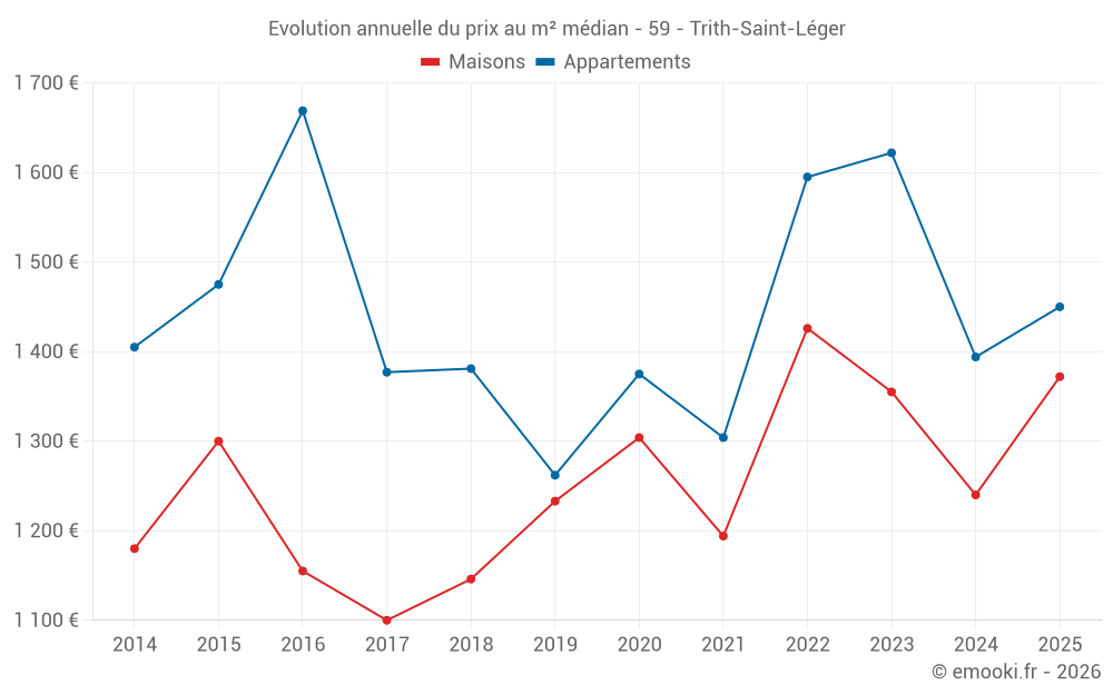 Le prix médian sur les 17 transactions d'appartements des 24 derniers mois dans la commune de Trith-Saint-Léger était de 1 404 € par mètre carré pour une valeur foncière médiane de 101 500 €. Sur cette période 60% des transactions se sont situées entre 998 et 1 660 € par mètre carré (du 2ème au 8ème déciles).
