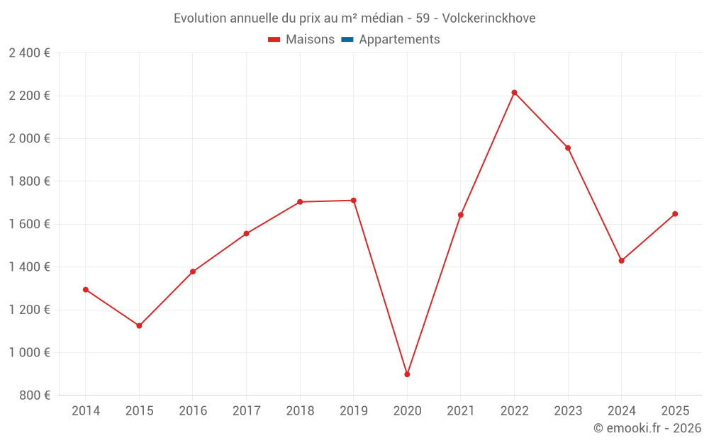 Le prix médian sur les 17 transactions de maisons des 24 derniers mois dans la commune de Volckerinckhove était de 1 682 € par mètre carré pour une valeur foncière médiane de 201 000 €. Sur cette période 60% des transactions se sont situées entre 660 et 2 198 € par mètre carré (du 2ème au 8ème déciles).