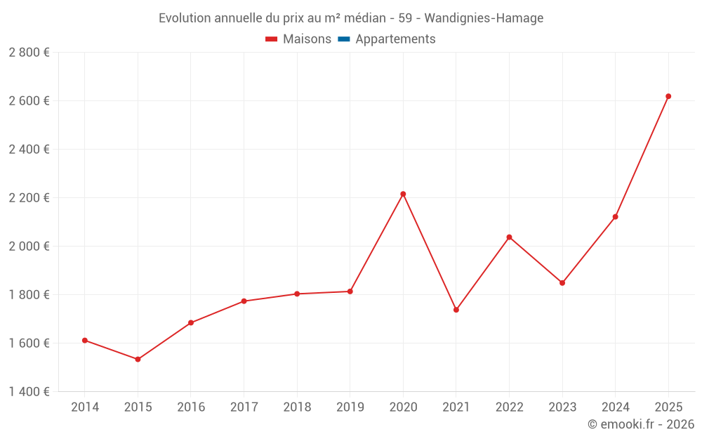 Le prix médian sur les 16 transactions de maisons des 12 derniers mois dans la commune de Wandignies-Hamage était de 2 184 € par mètre carré pour une valeur foncière médiane de 201 500 €. Sur cette période 60% des transactions se sont situées entre 1 587 et 2 788 € par mètre carré (du 2ème au 8ème déciles).