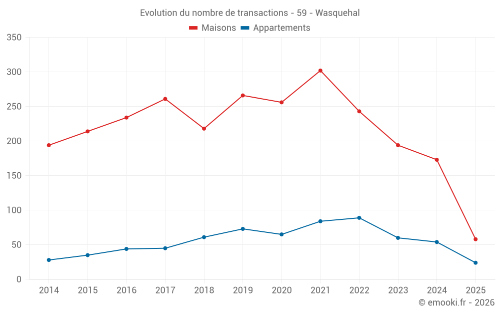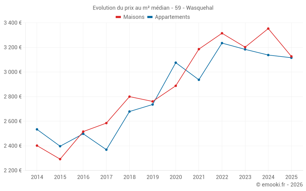 Le prix médian sur les 25 transactions de maisons des 3 derniers mois dans la commune de Wasquehal était de 2 530 € par mètre carré pour une valeur foncière médiane de 221 000 €. Sur cette période 60% des transactions se sont situées entre 2 062 et 3 742 € par mètre carré (du 2ème au 8ème déciles).