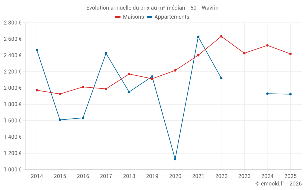 Le prix médian sur les 32 transactions de maisons des 6 derniers mois dans la commune de Wavrin était de 2 418 € par mètre carré pour une valeur foncière médiane de 233 965 €. Sur cette période 60% des transactions se sont situées entre 1 826 et 2 852 € par mètre carré (du 2ème au 8ème déciles).