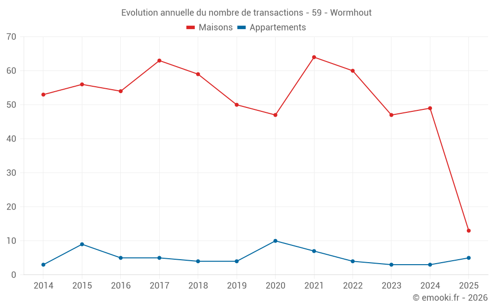 Le prix médian sur les 44 transactions de maisons des 12 derniers mois dans la commune de Wormhout était de 2 029 € par mètre carré pour une valeur foncière médiane de 173 550 €. Sur cette période 60% des transactions se sont situées entre 1 473 et 2 512 € par mètre carré (du 2ème au 8ème déciles).