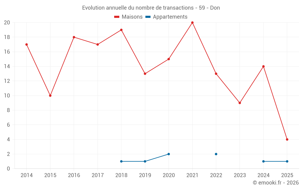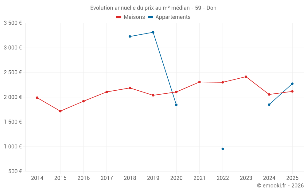 Le prix médian sur les 18 transactions de maisons des 24 derniers mois dans la commune de Don était de 2 054 € par mètre carré pour une valeur foncière médiane de 199 000 €. Sur cette période 60% des transactions se sont situées entre 1 724 et 2 645 € par mètre carré (du 2ème au 8ème déciles).