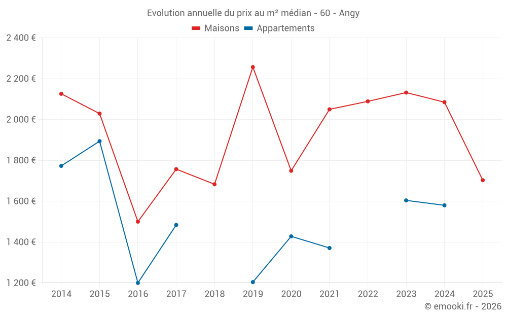 Le prix médian sur les 25 transactions de maisons des 24 derniers mois dans la commune d'Angy était de 1 913 € par mètre carré pour une valeur foncière médiane de 200 000 €. Sur cette période 60% des transactions se sont situées entre 1 676 et 2 361 € par mètre carré (du 2ème au 8ème déciles).