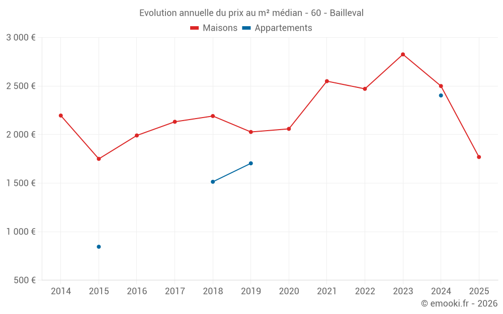 Le prix médian sur les 24 transactions de maisons des 24 derniers mois dans la commune de Bailleval était de 2 480 € par mètre carré pour une valeur foncière médiane de 193 000 €. Sur cette période 60% des transactions se sont situées entre 1 526 et 2 950 € par mètre carré (du 2ème au 8ème déciles).