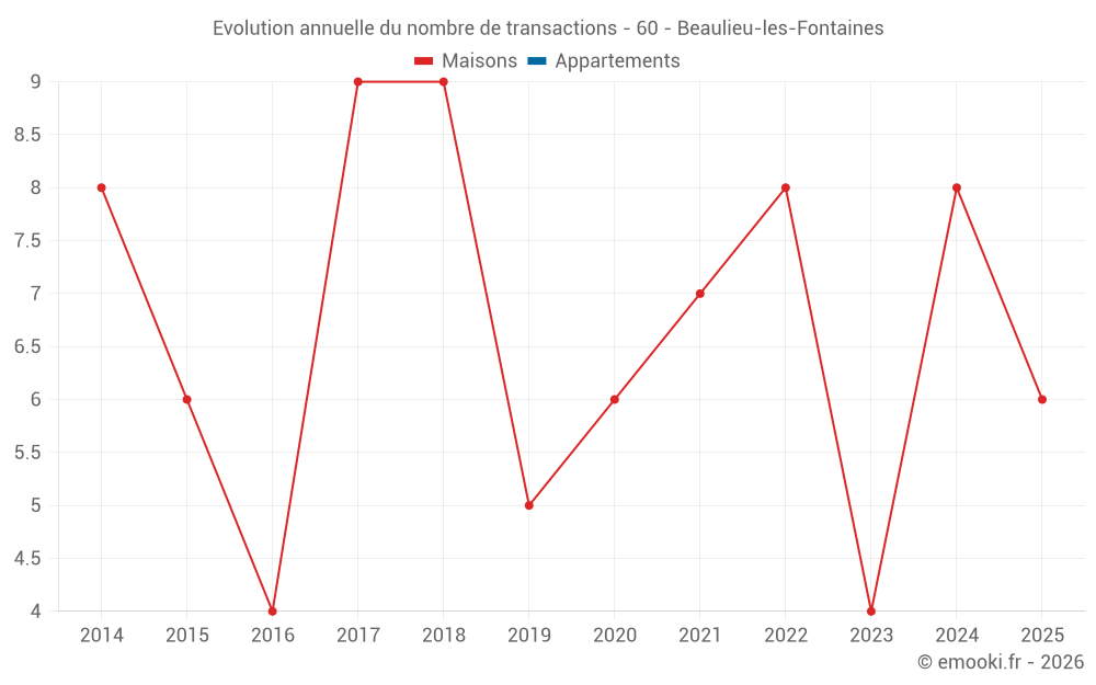 Le prix médian sur les 15 transactions de maisons des 24 derniers mois dans la commune de Beaulieu-les-Fontaines était de 996 € par mètre carré pour une valeur foncière médiane de 108 000 €. Sur cette période 60% des transactions se sont situées entre 822 et 1 686 € par mètre carré (du 2ème au 8ème déciles).