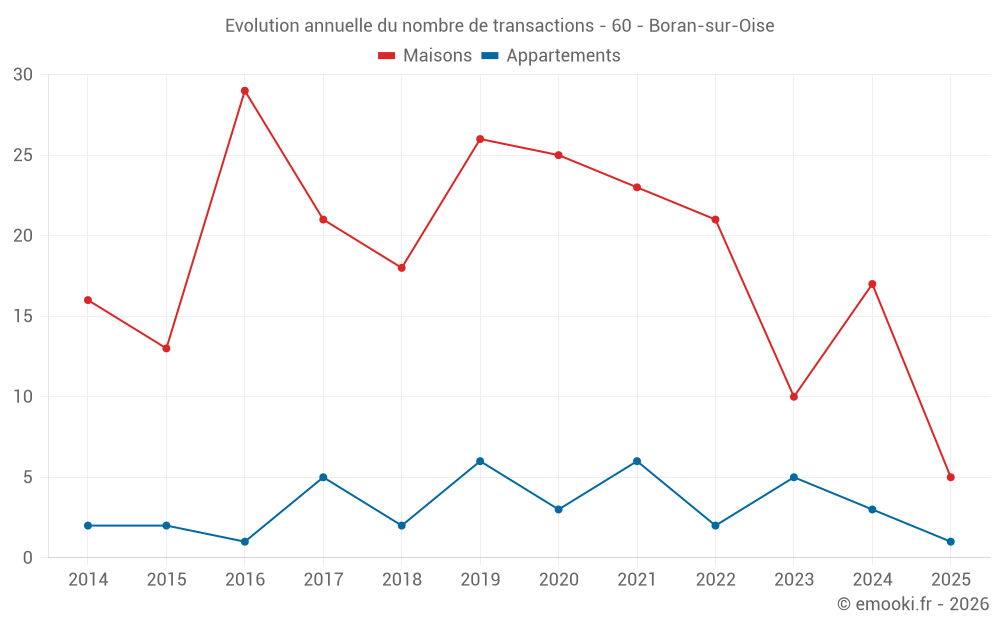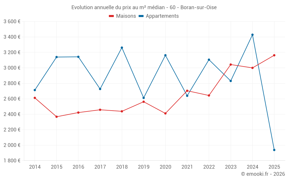 Le prix médian sur les 27 transactions de maisons des 24 derniers mois dans la commune de Boran-sur-Oise était de 3 026 € par mètre carré pour une valeur foncière médiane de 272 000 €. Sur cette période 60% des transactions se sont situées entre 2 512 et 3 542 € par mètre carré (du 2ème au 8ème déciles).