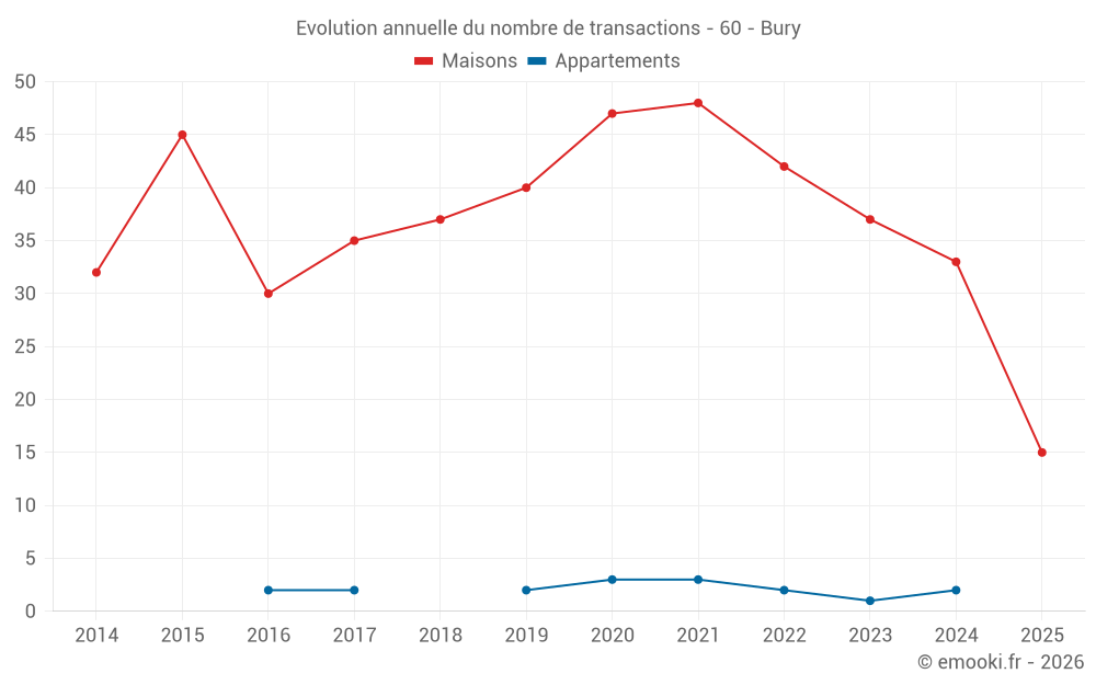 Le prix médian sur les 31 transactions de maisons des 12 derniers mois dans la commune de Bury était de 1 803 € par mètre carré pour une valeur foncière médiane de 170 000 €. Sur cette période 60% des transactions se sont situées entre 1 471 et 2 532 € par mètre carré (du 2ème au 8ème déciles).
