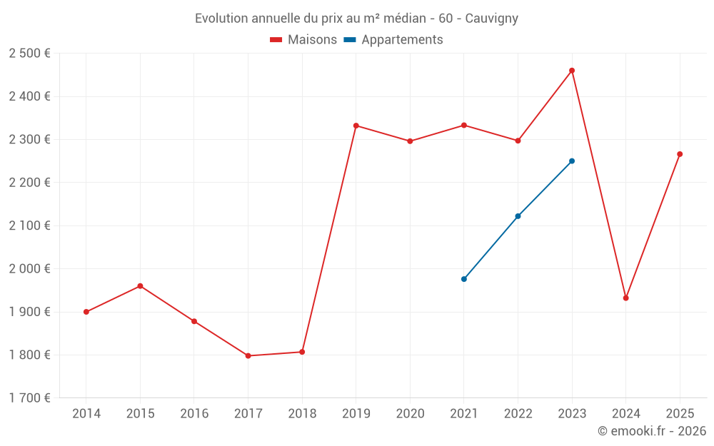 Le prix médian sur les 19 transactions de maisons des 12 derniers mois dans la commune de Cauvigny était de 2 120 € par mètre carré pour une valeur foncière médiane de 239 000 €. Sur cette période 60% des transactions se sont situées entre 1 235 et 2 862 € par mètre carré (du 2ème au 8ème déciles).