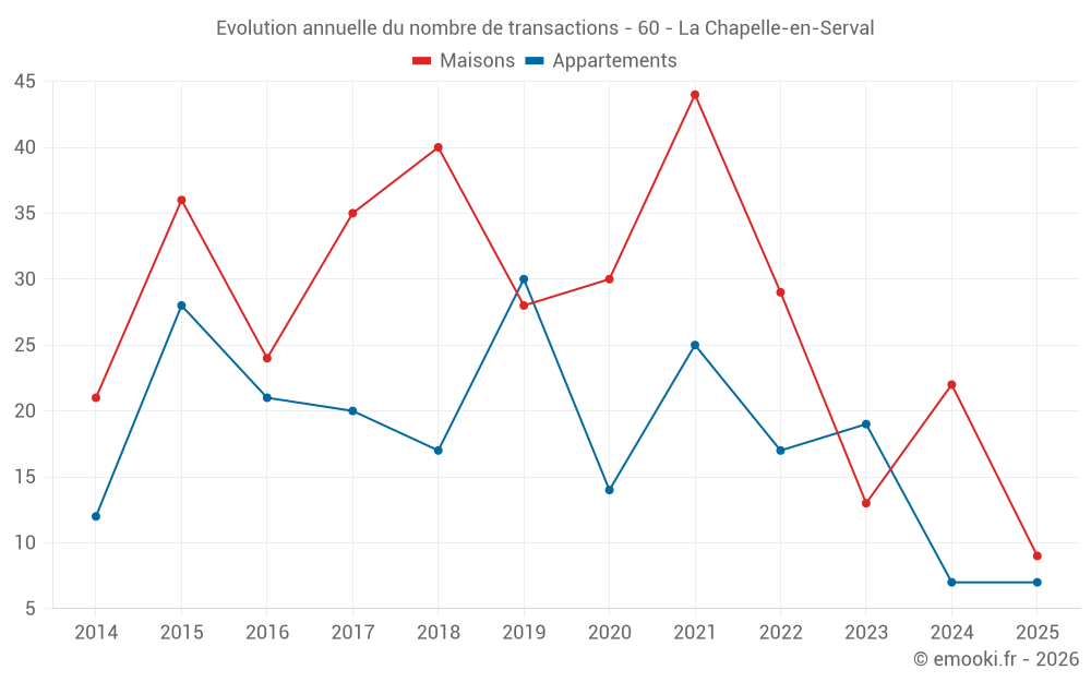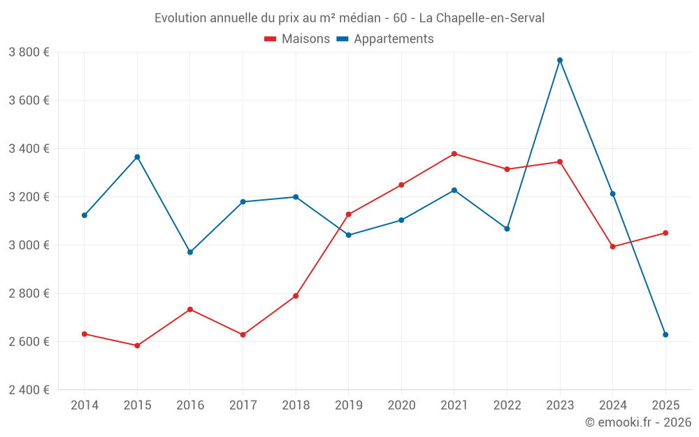 Le prix médian sur les 24 transactions de maisons des 12 derniers mois dans la commune de la Chapelle-en-Serval était de 3 026 € par mètre carré pour une valeur foncière médiane de 353 750 €. Sur cette période 60% des transactions se sont situées entre 2 496 et 4 034 € par mètre carré (du 2ème au 8ème déciles).