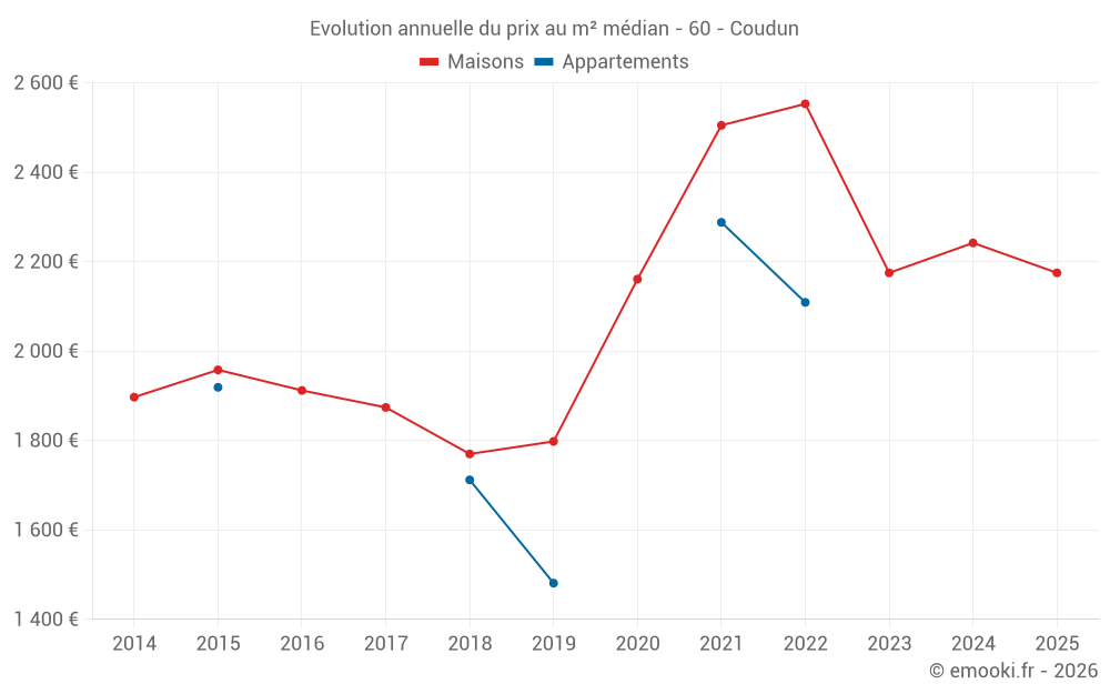 Le prix médian sur les 22 transactions de maisons des 24 derniers mois dans la commune de Coudun était de 2 182 € par mètre carré pour une valeur foncière médiane de 192 500 €. Sur cette période 60% des transactions se sont situées entre 1 578 et 2 839 € par mètre carré (du 2ème au 8ème déciles).