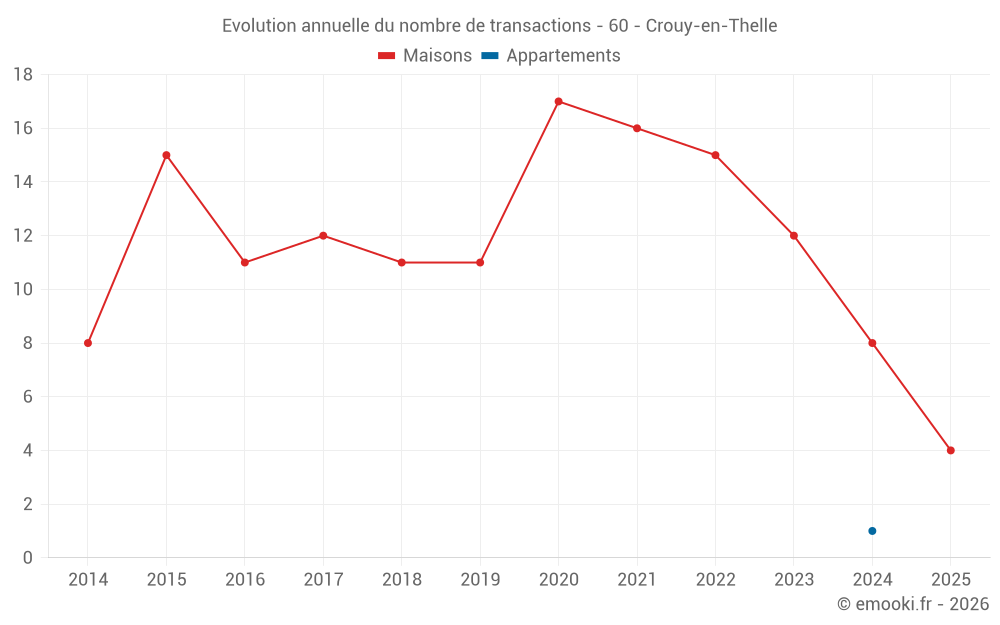 Le prix médian sur les 18 transactions de maisons des 24 derniers mois dans la commune de Crouy-en-Thelle était de 2 700 € par mètre carré pour une valeur foncière médiane de 254 500 €. Sur cette période 60% des transactions se sont situées entre 2 104 et 3 723 € par mètre carré (du 2ème au 8ème déciles).