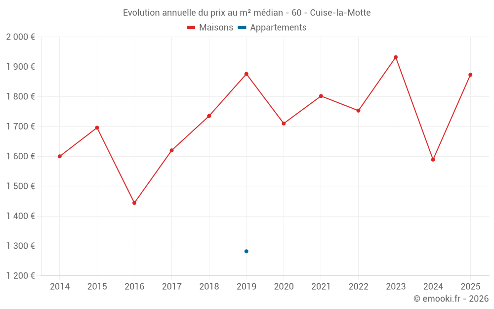 Le prix médian sur les 22 transactions de maisons des 12 derniers mois dans la commune de Cuise-la-Motte était de 1 696 € par mètre carré pour une valeur foncière médiane de 151 750 €. Sur cette période 60% des transactions se sont situées entre 1 310 et 2 056 € par mètre carré (du 2ème au 8ème déciles).