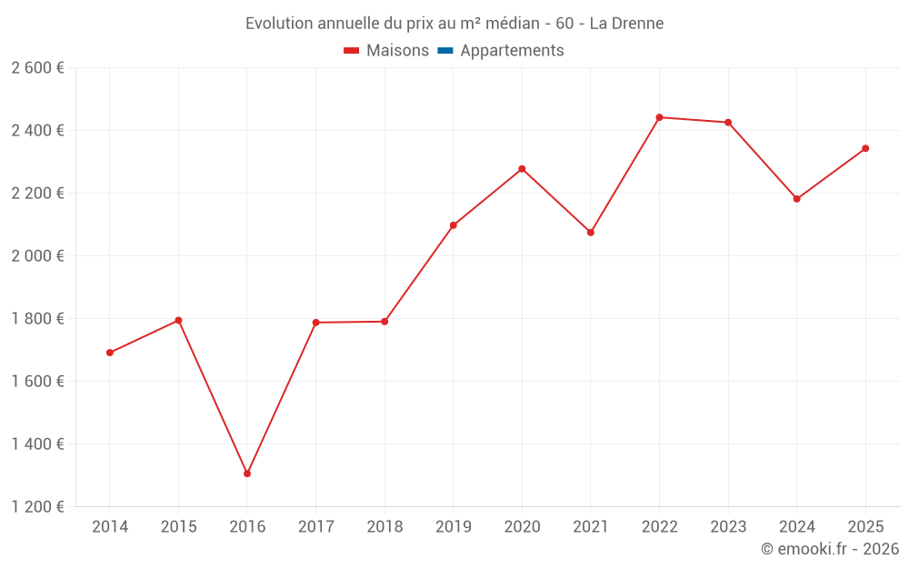 Le prix médian sur les 32 transactions de maisons des 24 derniers mois dans la commune de la Drenne était de 2 161 € par mètre carré pour une valeur foncière médiane de 220 950 €. Sur cette période 60% des transactions se sont situées entre 1 754 et 2 658 € par mètre carré (du 2ème au 8ème déciles).
