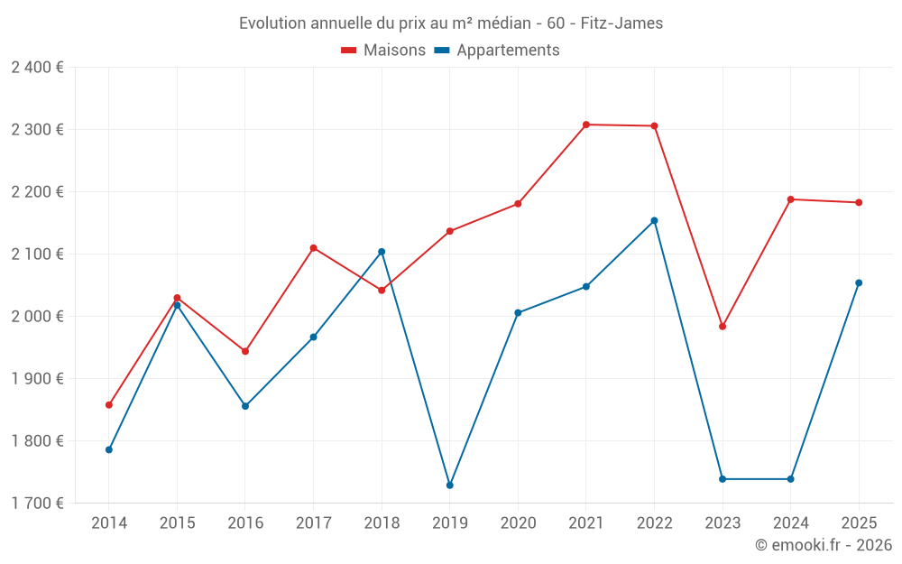 Le prix médian sur les 21 transactions d'appartements des 24 derniers mois dans la commune de Fitz-James était de 2 020 € par mètre carré pour une valeur foncière médiane de 108 000 €. Sur cette période 60% des transactions se sont situées entre 1 310 et 2 254 € par mètre carré (du 2ème au 8ème déciles).