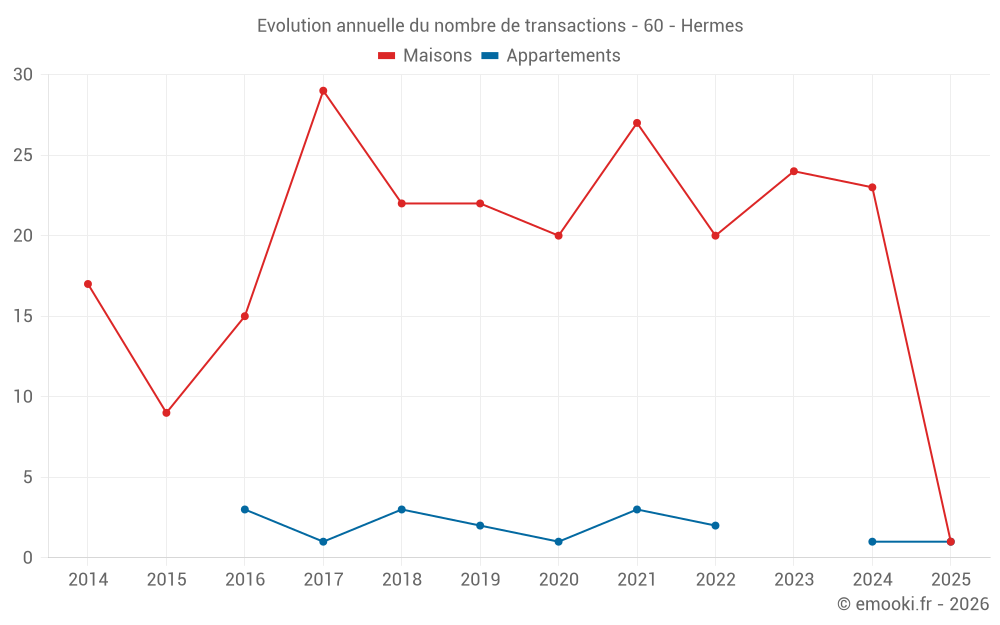 Le prix médian sur les 40 transactions de maisons des 24 derniers mois dans la commune de Hermes était de 2 125 € par mètre carré pour une valeur foncière médiane de 192 500 €. Sur cette période 60% des transactions se sont situées entre 1 831 et 2 668 € par mètre carré (du 2ème au 8ème déciles).
