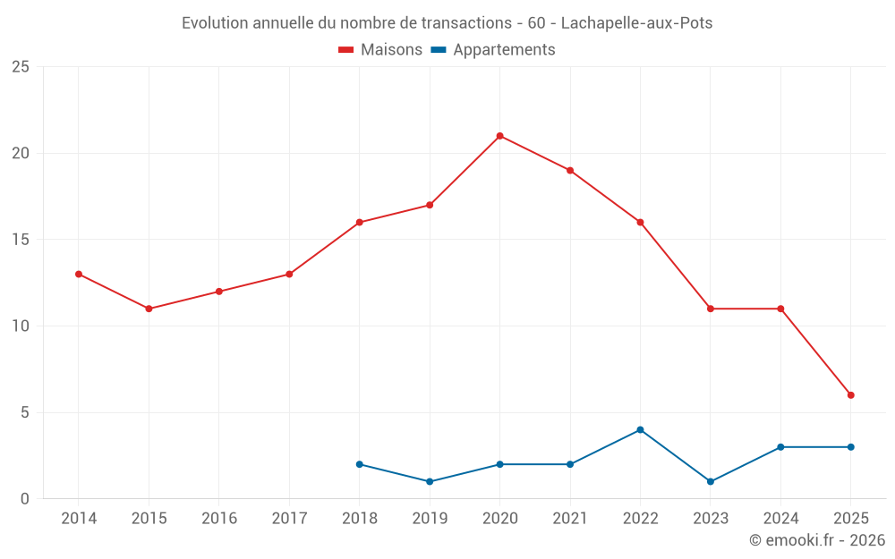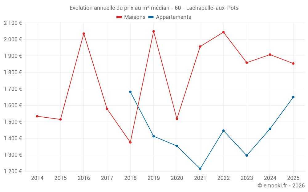 Le prix médian sur les 24 transactions de maisons des 24 derniers mois dans la commune de Lachapelle-aux-Pots était de 1 826 € par mètre carré pour une valeur foncière médiane de 184 560 €. Sur cette période 60% des transactions se sont situées entre 1 153 et 2 614 € par mètre carré (du 2ème au 8ème déciles).