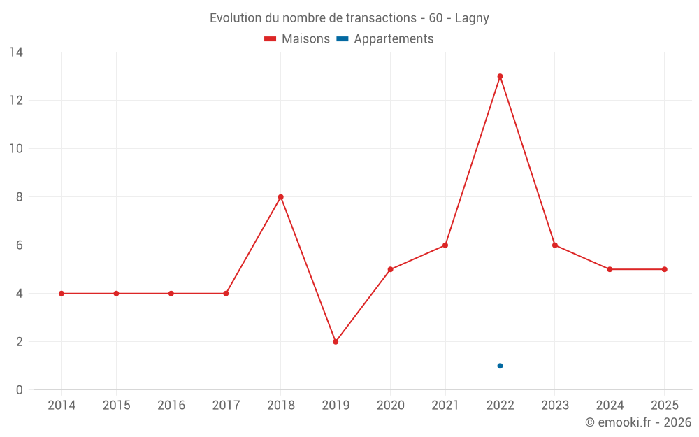 Le prix médian sur les 14 transactions de maisons des 24 derniers mois dans la commune de Lagny était de 1 396 € par mètre carré pour une valeur foncière médiane de 137 250 €. Sur cette période 60% des transactions se sont situées entre 963 et 1 851 € par mètre carré (du 2ème au 8ème déciles).
