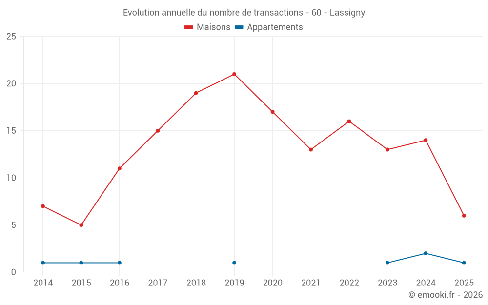 Le prix médian sur les 23 transactions de maisons des 24 derniers mois dans la commune de Lassigny était de 1 676 € par mètre carré pour une valeur foncière médiane de 162 000 €. Sur cette période 60% des transactions se sont situées entre 1 305 et 2 191 € par mètre carré (du 2ème au 8ème déciles).