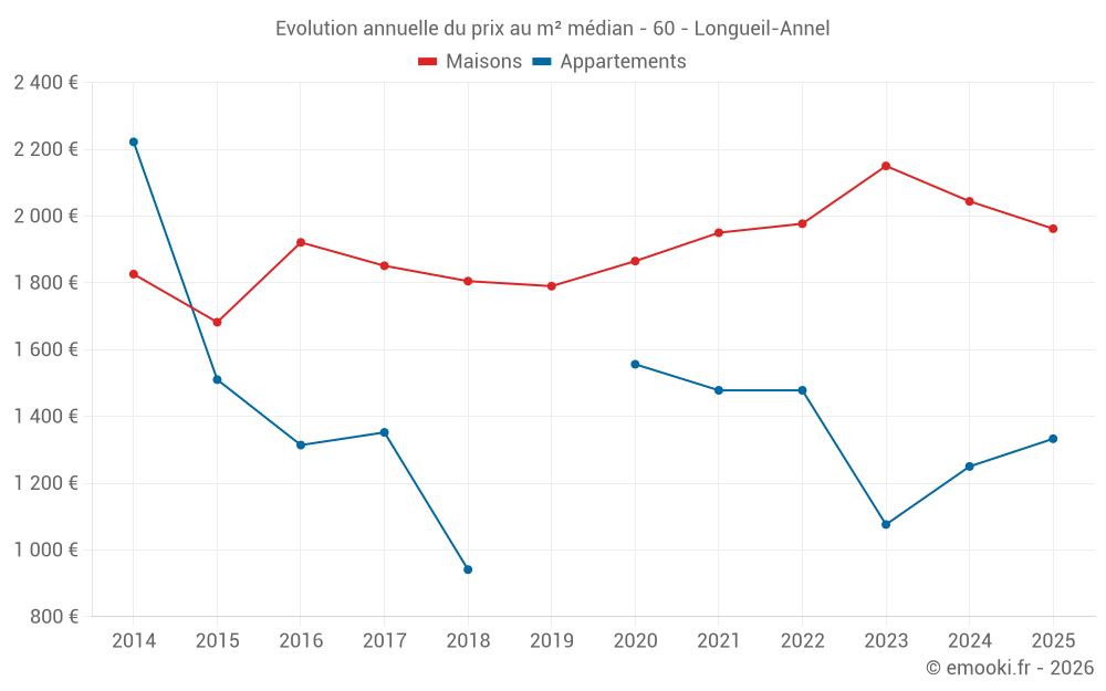 Le prix médian sur les 29 transactions de maisons des 12 derniers mois dans la commune de Longueil-Annel était de 1 993 € par mètre carré pour une valeur foncière médiane de 168 000 €. Sur cette période 60% des transactions se sont situées entre 1 643 et 2 262 € par mètre carré (du 2ème au 8ème déciles).