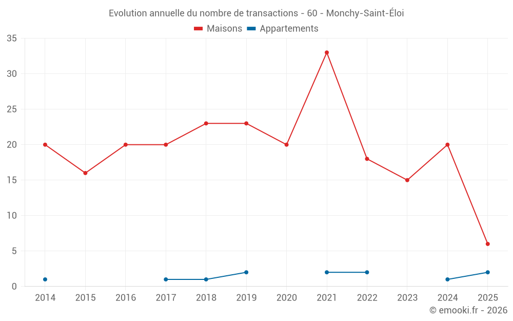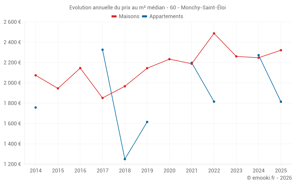 Le prix médian sur les 16 transactions de maisons des 12 derniers mois dans la commune de Monchy-Saint-Éloi était de 2 190 € par mètre carré pour une valeur foncière médiane de 195 000 €. Sur cette période 60% des transactions se sont situées entre 1 839 et 2 549 € par mètre carré (du 2ème au 8ème déciles).