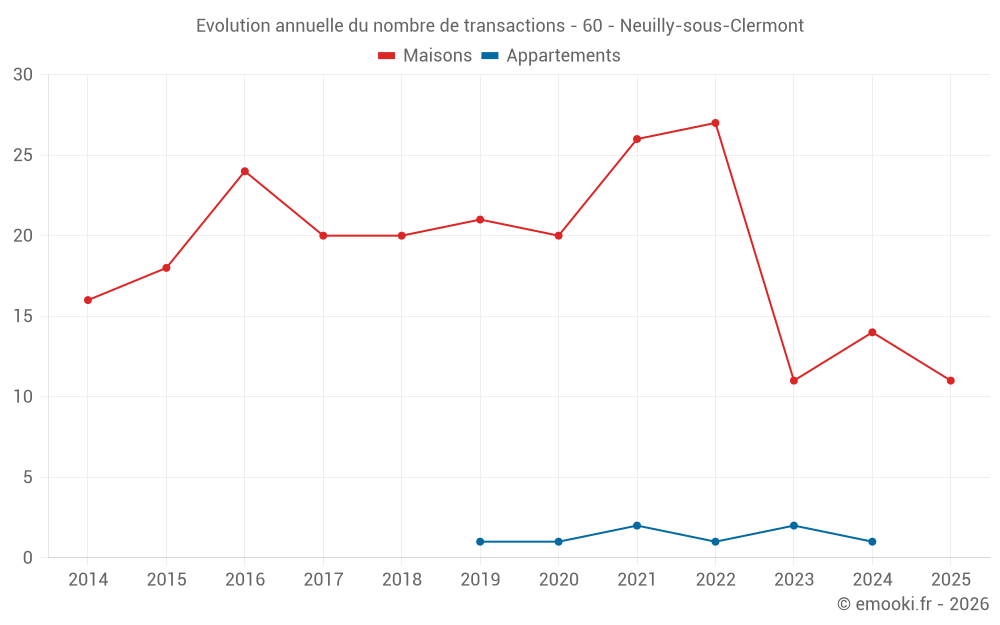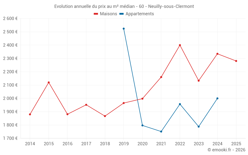 Le prix médian sur les 19 transactions de maisons des 12 derniers mois dans la commune de Neuilly-sous-Clermont était de 2 282 € par mètre carré pour une valeur foncière médiane de 218 000 €. Sur cette période 60% des transactions se sont situées entre 1 781 et 2 676 € par mètre carré (du 2ème au 8ème déciles).