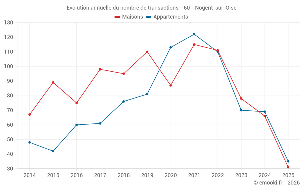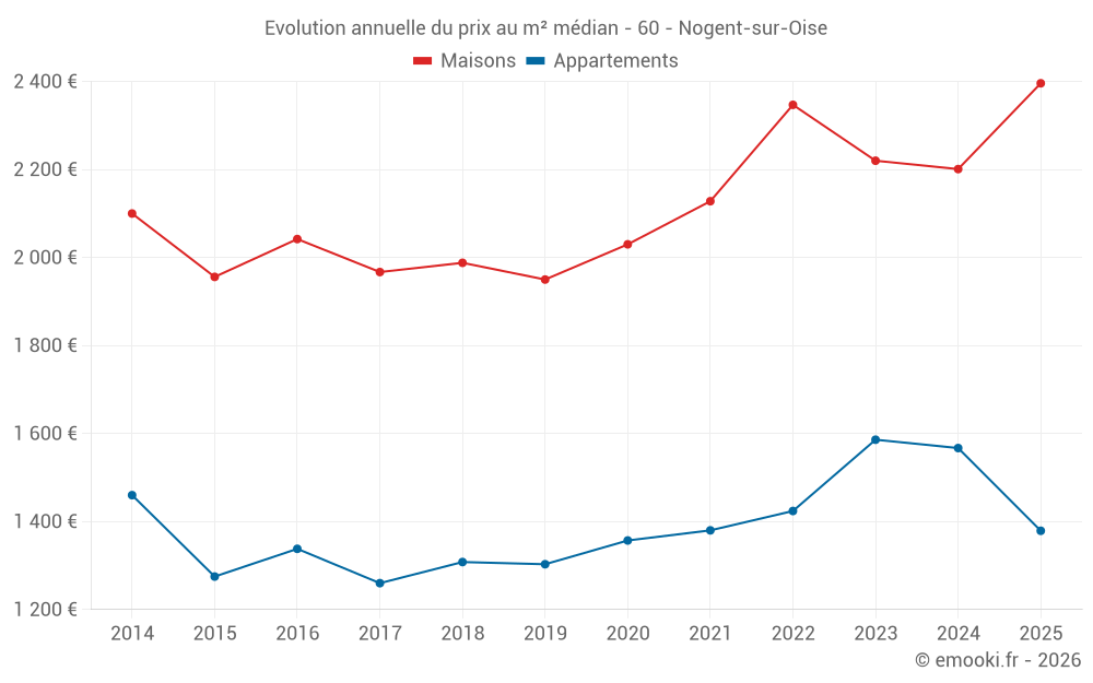 Le prix médian sur les 31 transactions de maisons des 6 derniers mois dans la commune de Nogent-sur-Oise était de 2 396 € par mètre carré pour une valeur foncière médiane de 169 900 €. Sur cette période 60% des transactions se sont situées entre 1 750 et 2 724 € par mètre carré (du 2ème au 8ème déciles).