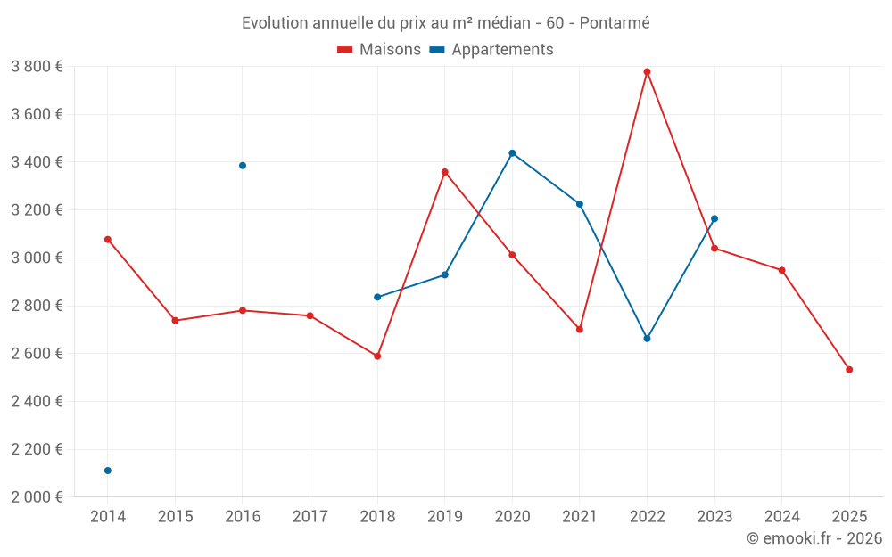 Le prix médian sur les 18 transactions de maisons des 24 derniers mois dans la commune de Pontarmé était de 2 970 € par mètre carré pour une valeur foncière médiane de 348 085 €. Sur cette période 60% des transactions se sont situées entre 2 638 et 3 484 € par mètre carré (du 2ème au 8ème déciles).