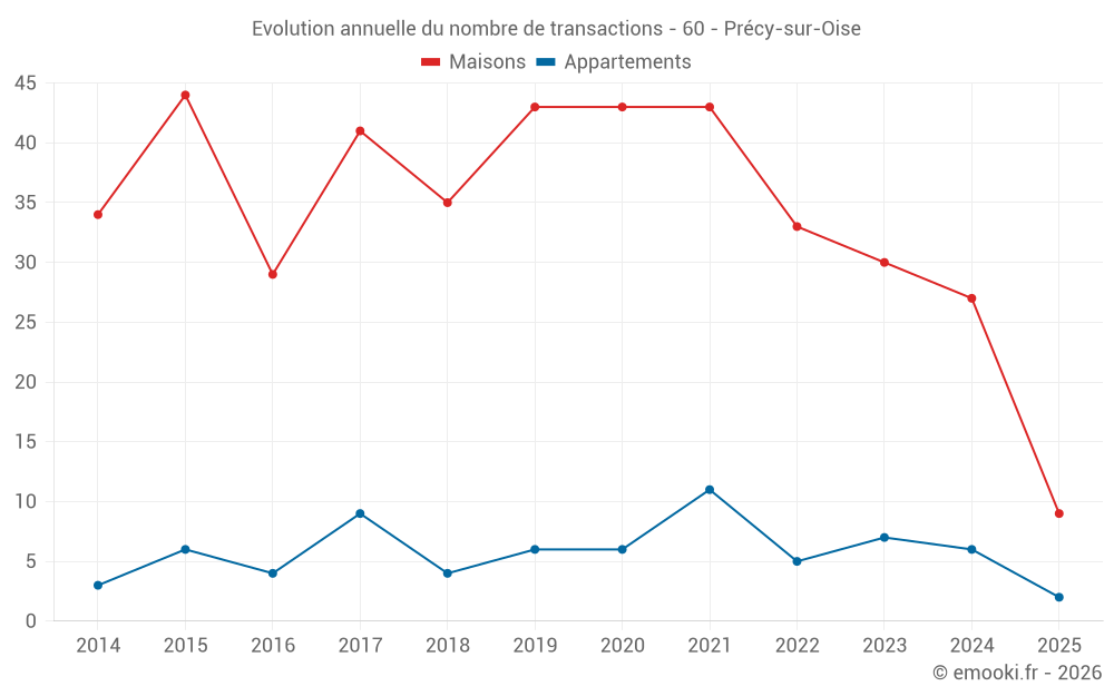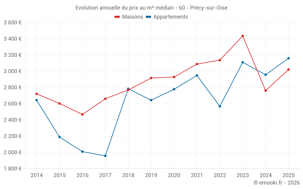 Le prix médian sur les 23 transactions de maisons des 12 derniers mois dans la commune de Précy-sur-Oise était de 2 845 € par mètre carré pour une valeur foncière médiane de 280 000 €. Sur cette période 60% des transactions se sont situées entre 2 110 et 3 287 € par mètre carré (du 2ème au 8ème déciles).