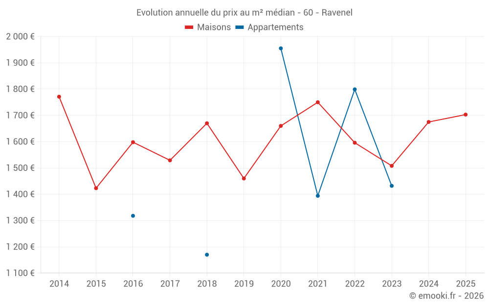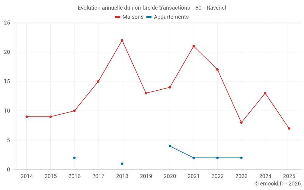 Le prix médian sur les 23 transactions de maisons des 24 derniers mois dans la commune de Ravenel était de 1 675 € par mètre carré pour une valeur foncière médiane de 139 000 €. Sur cette période 60% des transactions se sont situées entre 1 292 et 1 982 € par mètre carré (du 2ème au 8ème déciles).