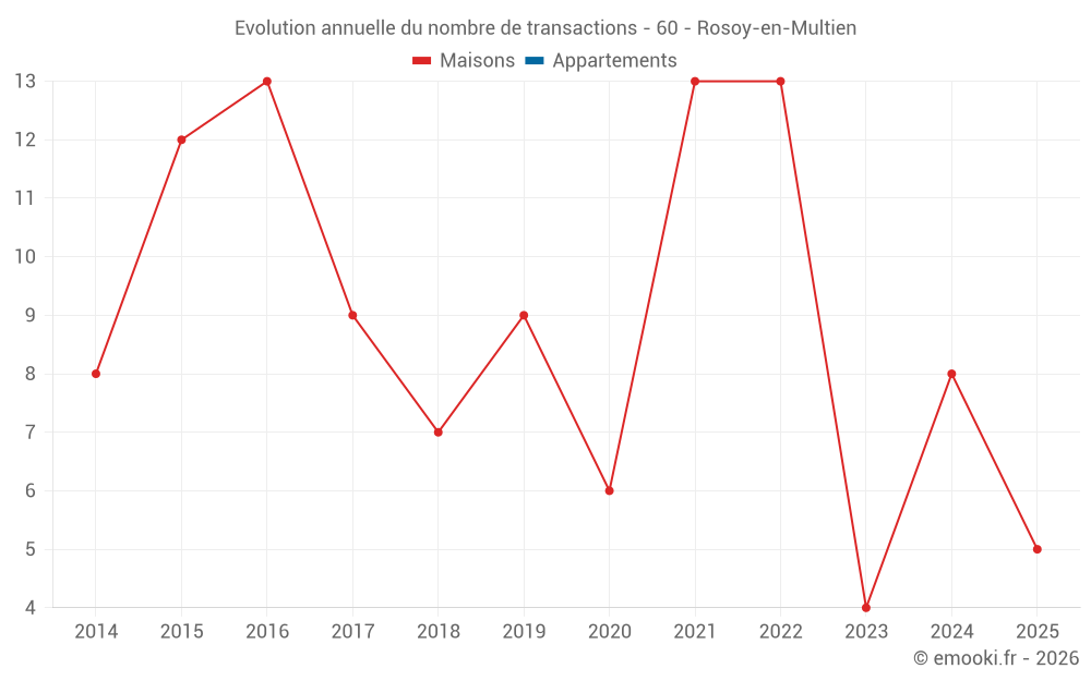 Le prix médian sur les 16 transactions de maisons des 24 derniers mois dans la commune de Rosoy-en-Multien était de 2 318 € par mètre carré pour une valeur foncière médiane de 229 400 €. Sur cette période 60% des transactions se sont situées entre 1 520 et 2 714 € par mètre carré (du 2ème au 8ème déciles).