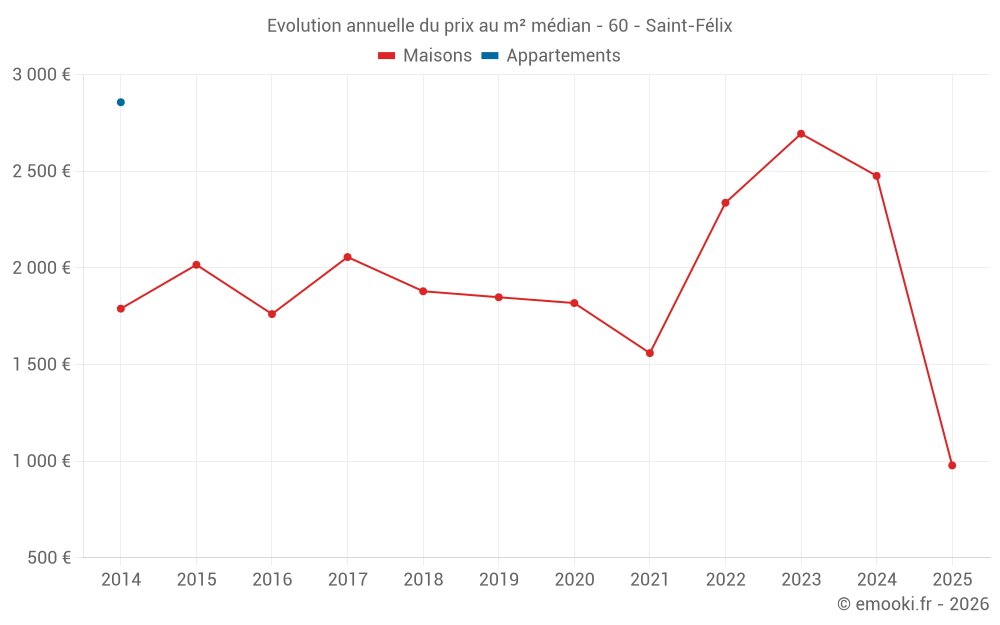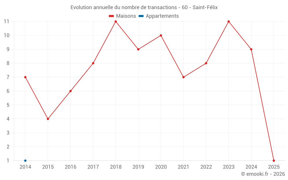 Le prix médian sur les 16 transactions de maisons des 24 derniers mois dans la commune de Saint-Félix était de 2 524 € par mètre carré pour une valeur foncière médiane de 231 000 €. Sur cette période 60% des transactions se sont situées entre 1 899 et 2 700 € par mètre carré (du 2ème au 8ème déciles).