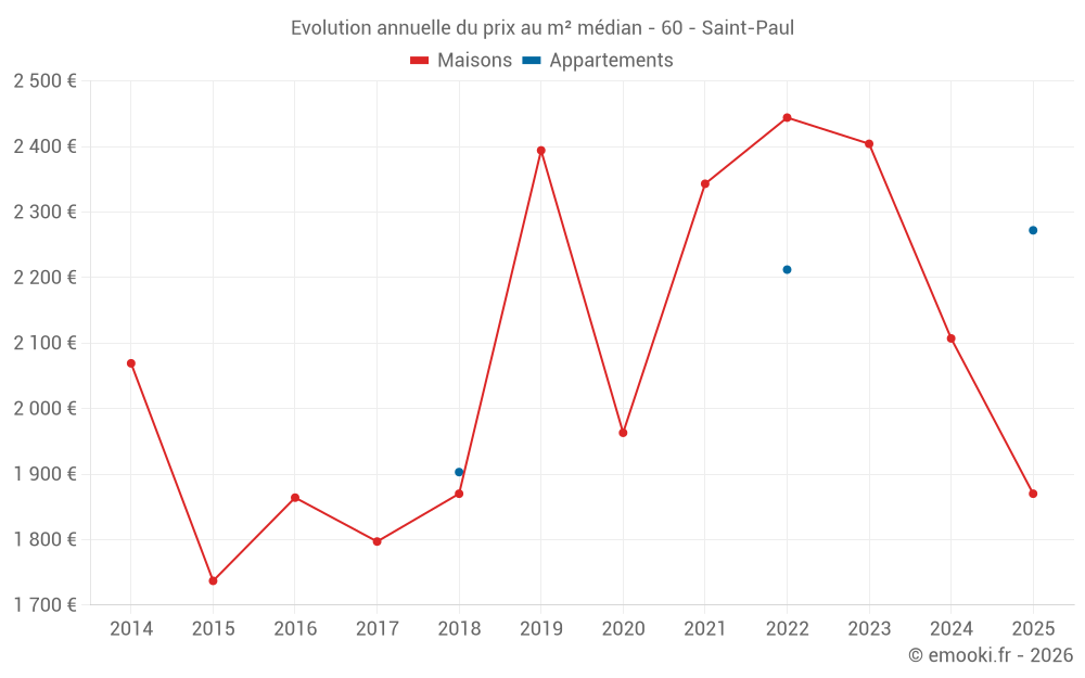 Le prix médian sur les 18 transactions de maisons des 12 derniers mois dans la commune de Saint-Paul était de 1 796 € par mètre carré pour une valeur foncière médiane de 233 000 €. Sur cette période 60% des transactions se sont situées entre 1 371 et 2 337 € par mètre carré (du 2ème au 8ème déciles).