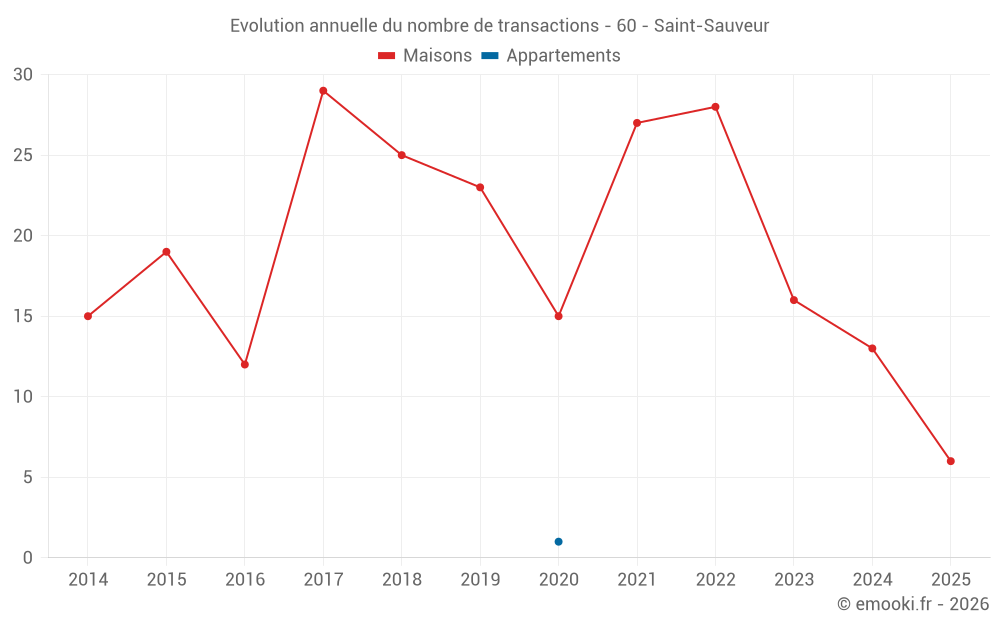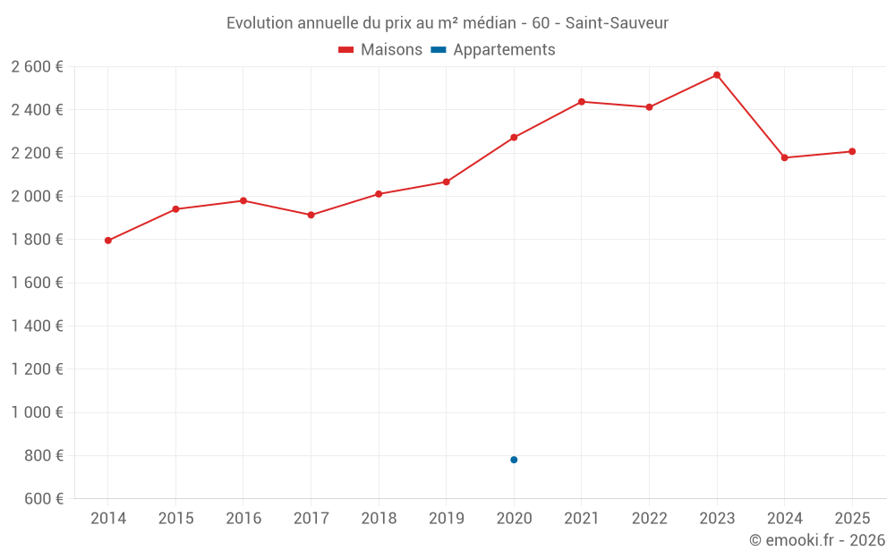 Le prix médian sur les 25 transactions de maisons des 24 derniers mois dans la commune de Saint-Sauveur était de 2 179 € par mètre carré pour une valeur foncière médiane de 205 000 €. Sur cette période 60% des transactions se sont situées entre 1 603 et 2 861 € par mètre carré (du 2ème au 8ème déciles).