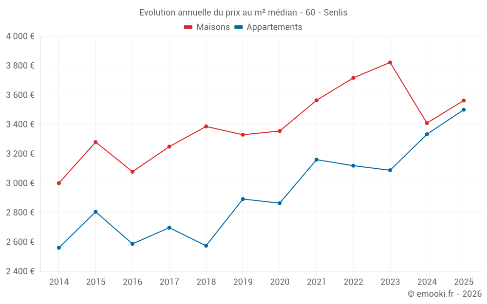 Le prix médian sur les 33 transactions de maisons des 6 derniers mois dans la commune de Senlis était de 3 563 € par mètre carré pour une valeur foncière médiane de 306 000 €. Sur cette période 60% des transactions se sont situées entre 2 654 et 4 107 € par mètre carré (du 2ème au 8ème déciles).