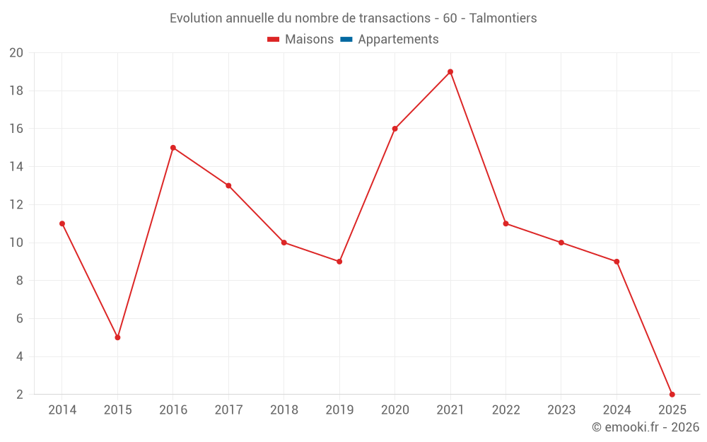Le prix médian sur les 17 transactions de maisons des 24 derniers mois dans la commune de Talmontiers était de 2 123 € par mètre carré pour une valeur foncière médiane de 190 000 €. Sur cette période 60% des transactions se sont situées entre 1 841 et 2 500 € par mètre carré (du 2ème au 8ème déciles).