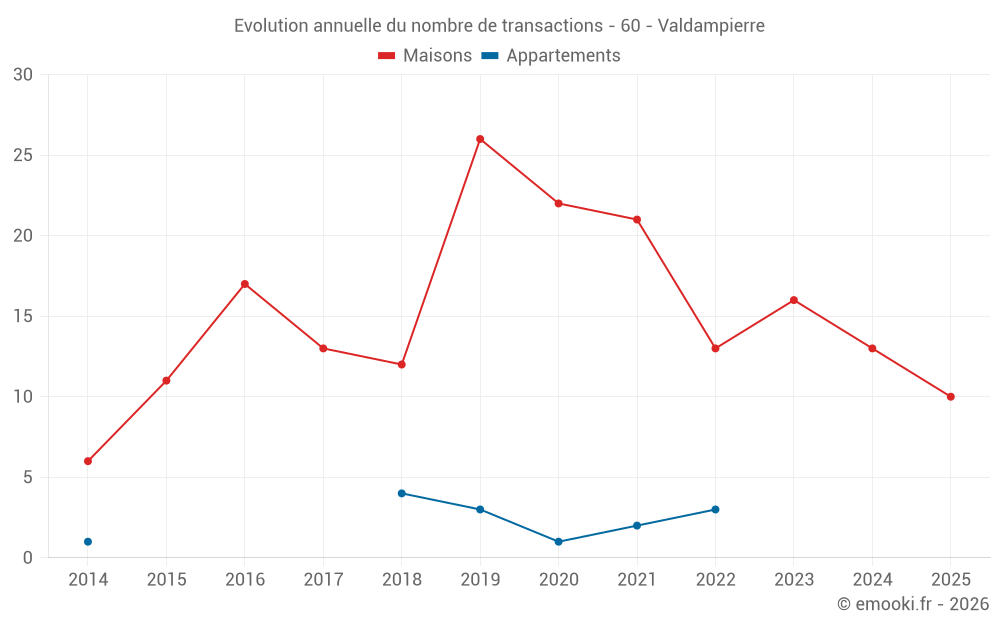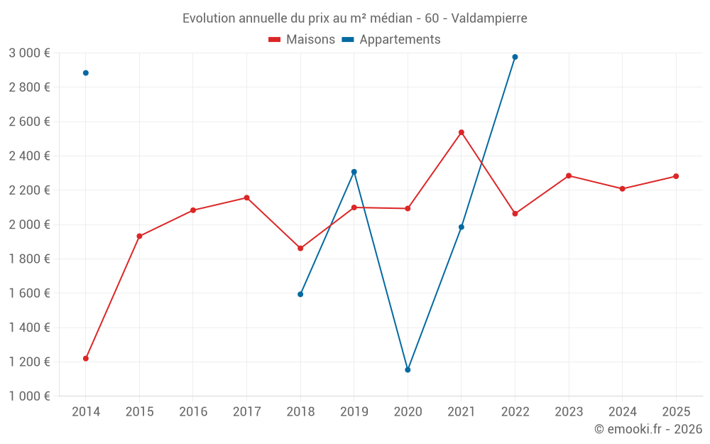 Le prix médian sur les 31 transactions de maisons des 24 derniers mois dans la commune de Valdampierre était de 2 333 € par mètre carré pour une valeur foncière médiane de 208 000 €. Sur cette période 60% des transactions se sont situées entre 1 768 et 2 910 € par mètre carré (du 2ème au 8ème déciles).