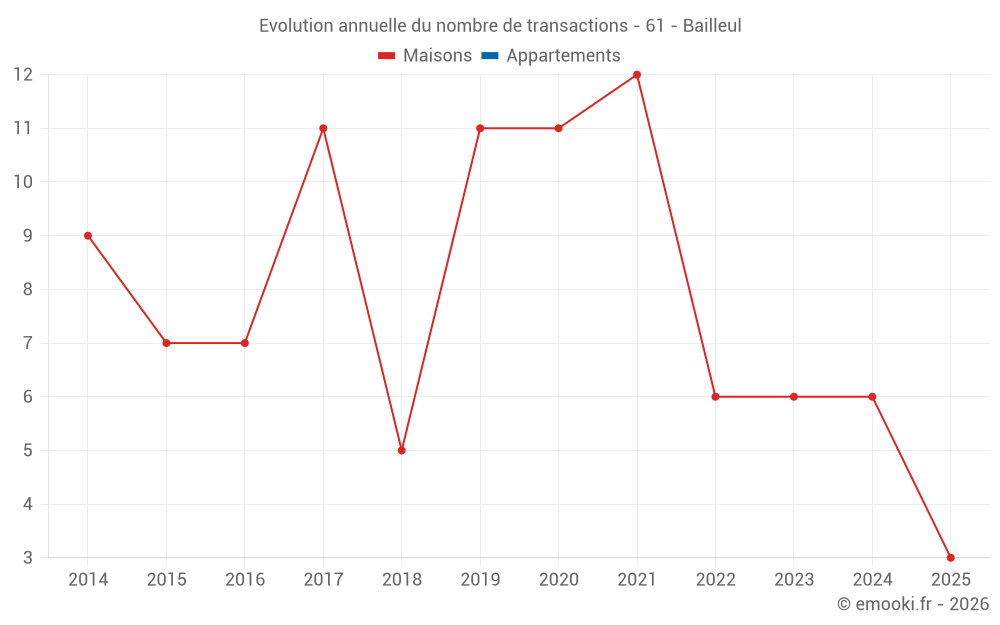 Le prix médian sur les 14 transactions de maisons des 24 derniers mois dans la commune de Bailleul était de 1 601 € par mètre carré pour une valeur foncière médiane de 142 500 €. Sur cette période 60% des transactions se sont situées entre 1 301 et 1 802 € par mètre carré (du 2ème au 8ème déciles).