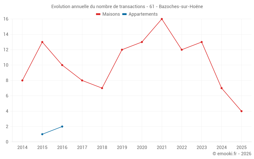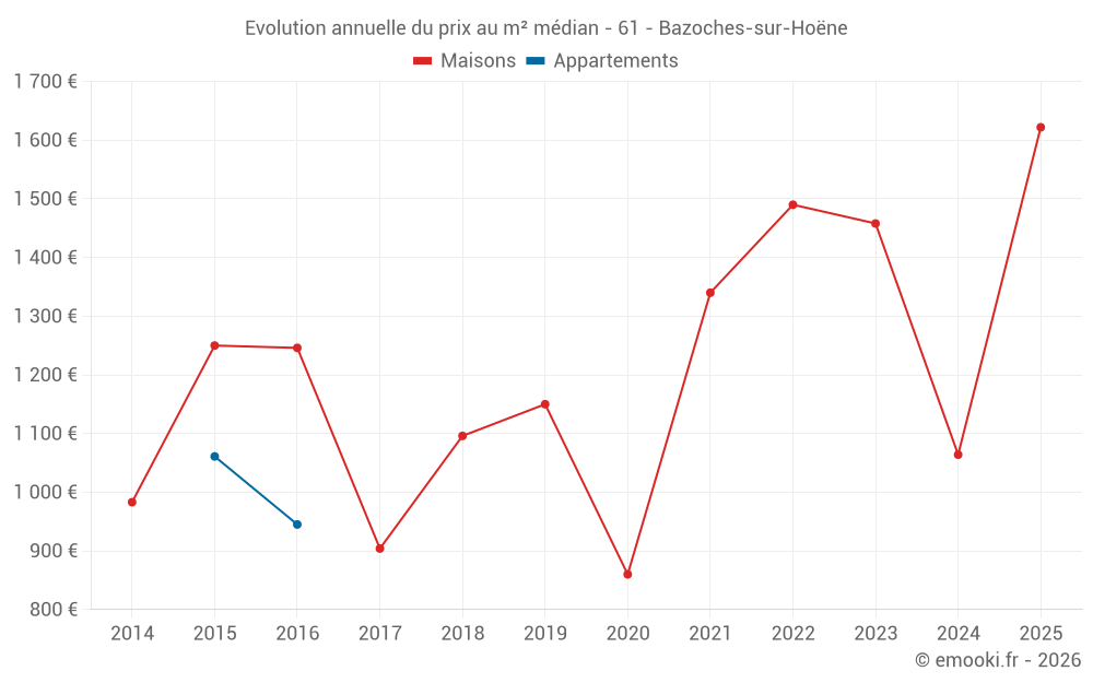Le prix médian sur les 18 transactions de maisons des 24 derniers mois dans la commune de Bazoches-sur-Hoëne était de 1 294 € par mètre carré pour une valeur foncière médiane de 131 000 €. Sur cette période 60% des transactions se sont situées entre 956 et 1 627 € par mètre carré (du 2ème au 8ème déciles).