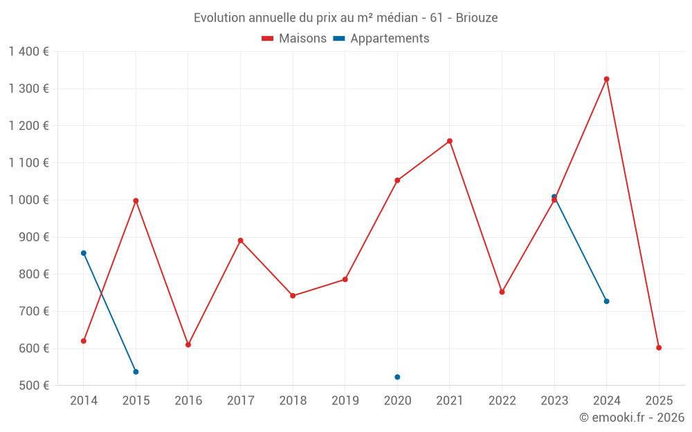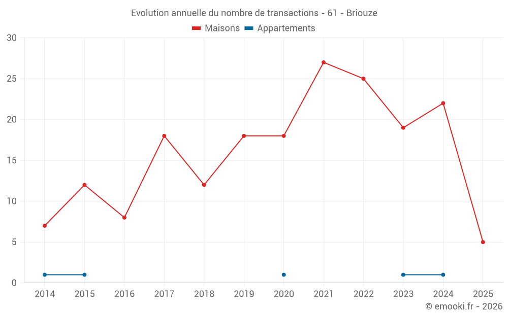 Le prix médian sur les 17 transactions de maisons des 12 derniers mois dans la commune de Briouze était de 1 297 € par mètre carré pour une valeur foncière médiane de 96 000 €. Sur cette période 60% des transactions se sont situées entre 633 et 1 836 € par mètre carré (du 2ème au 8ème déciles).