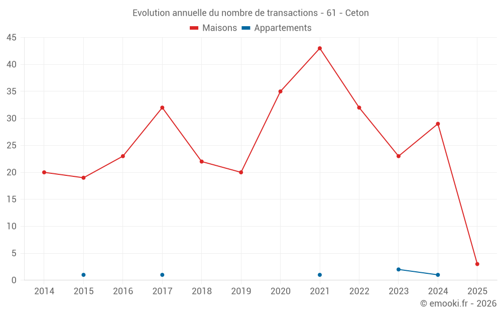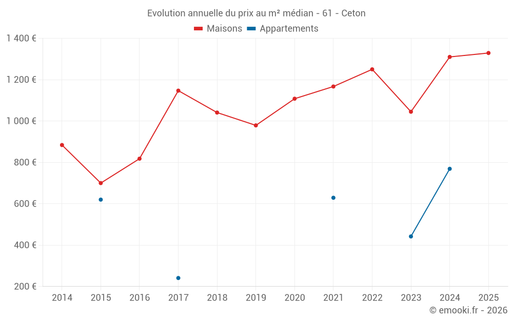 Le prix médian sur les 23 transactions de maisons des 12 derniers mois dans la commune de Ceton était de 1 318 € par mètre carré pour une valeur foncière médiane de 90 000 €. Sur cette période 60% des transactions se sont situées entre 618 et 1 507 € par mètre carré (du 2ème au 8ème déciles).