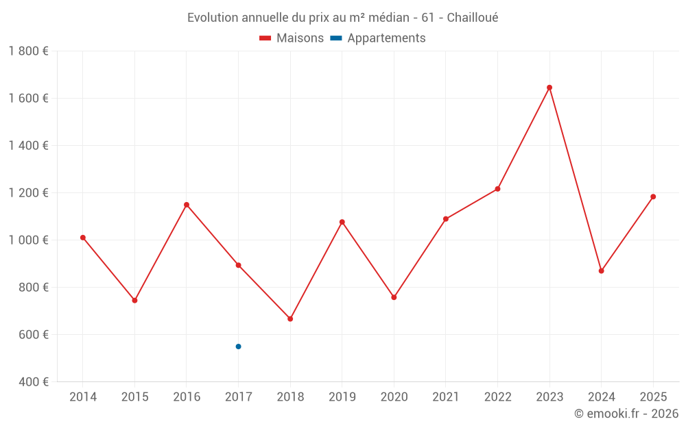 Le prix médian sur les 19 transactions de maisons des 24 derniers mois dans la commune de Chailloué était de 1 156 € par mètre carré pour une valeur foncière médiane de 130 000 €. Sur cette période 60% des transactions se sont situées entre 717 et 1 561 € par mètre carré (du 2ème au 8ème déciles).