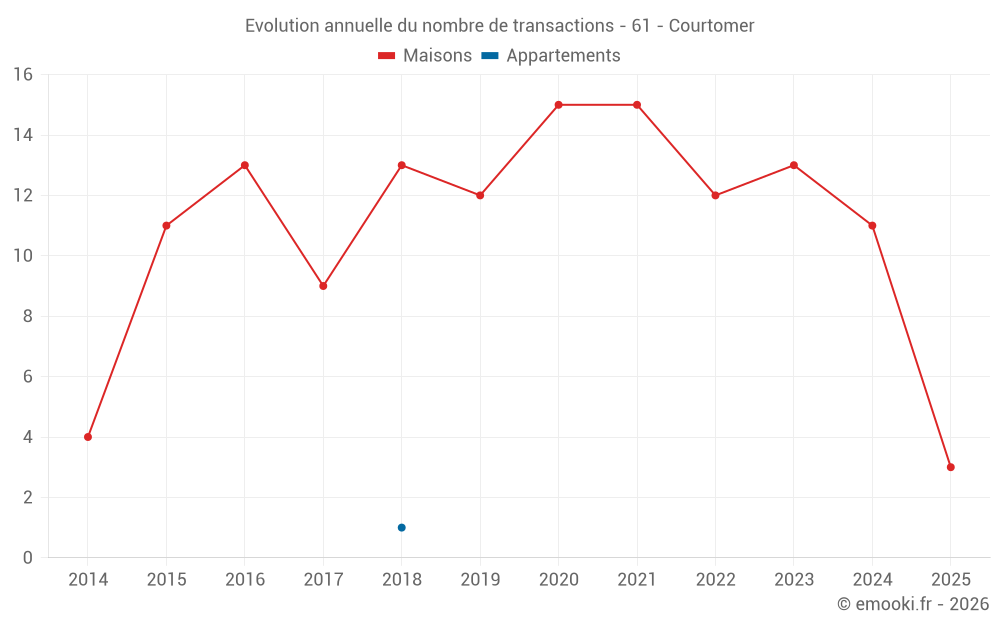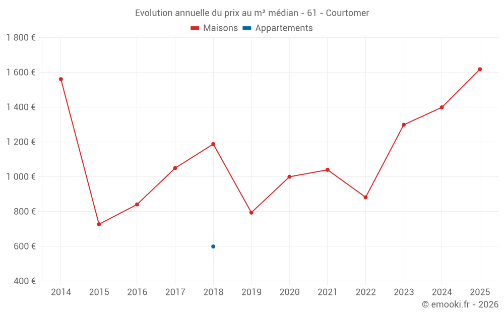 Le prix médian sur les 23 transactions de maisons des 24 derniers mois dans la commune de Courtomer était de 1 333 € par mètre carré pour une valeur foncière médiane de 123 100 €. Sur cette période 60% des transactions se sont situées entre 757 et 1 821 € par mètre carré (du 2ème au 8ème déciles).