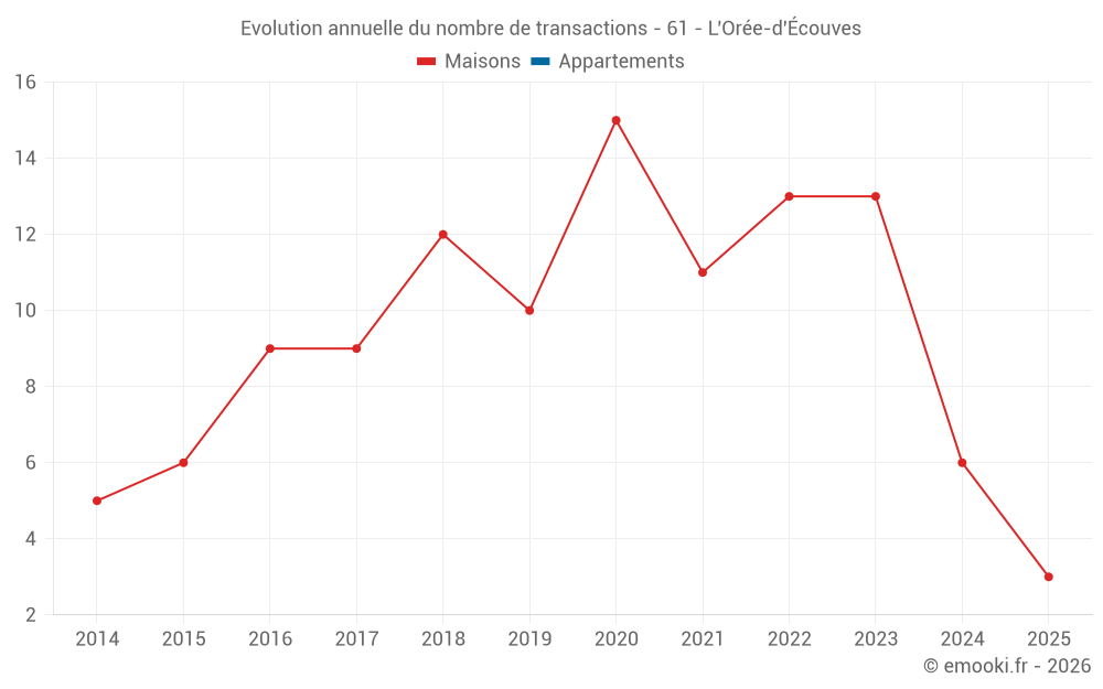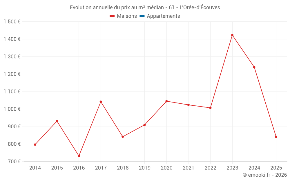Le prix médian sur les 17 transactions de maisons des 24 derniers mois dans la commune de l'Orée-d'Écouves était de 1 207 € par mètre carré pour une valeur foncière médiane de 111 000 €. Sur cette période 60% des transactions se sont situées entre 851 et 1 711 € par mètre carré (du 2ème au 8ème déciles).