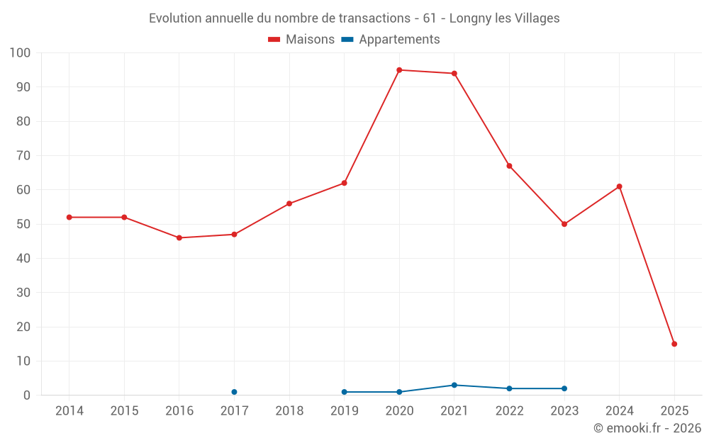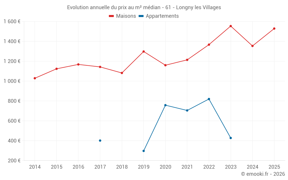 Le prix médian sur les 44 transactions de maisons des 12 derniers mois dans la commune de Longny les Villages était de 1 336 € par mètre carré pour une valeur foncière médiane de 127 500 €. Sur cette période 60% des transactions se sont situées entre 1 037 et 2 135 € par mètre carré (du 2ème au 8ème déciles).