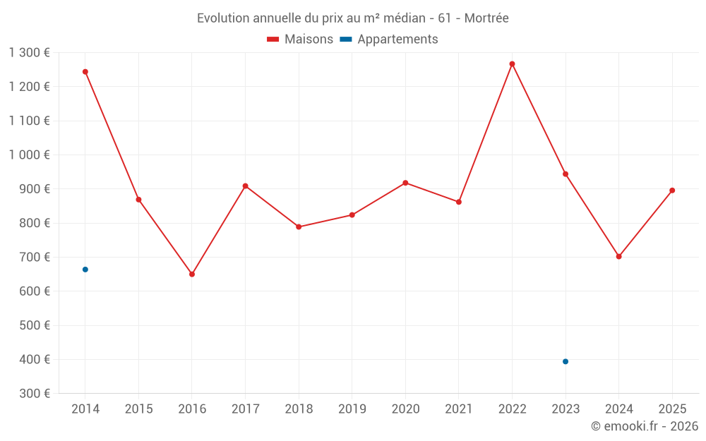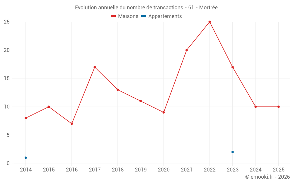 Le prix médian sur les 28 transactions de maisons des 24 derniers mois dans la commune de Mortrée était de 888 € par mètre carré pour une valeur foncière médiane de 80 000 €. Sur cette période 60% des transactions se sont situées entre 555 et 1 636 € par mètre carré (du 2ème au 8ème déciles).