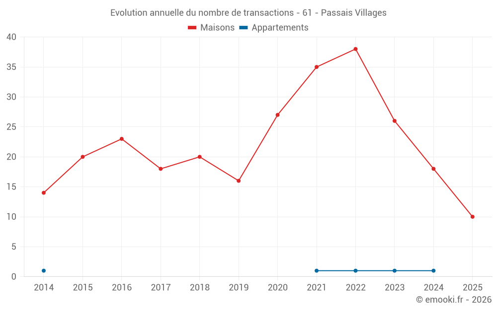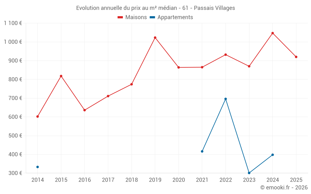 Le prix médian sur les 22 transactions de maisons des 12 derniers mois dans la commune de Passais Villages était de 920 € par mètre carré pour une valeur foncière médiane de 87 500 €. Sur cette période 60% des transactions se sont situées entre 686 et 1 267 € par mètre carré (du 2ème au 8ème déciles).