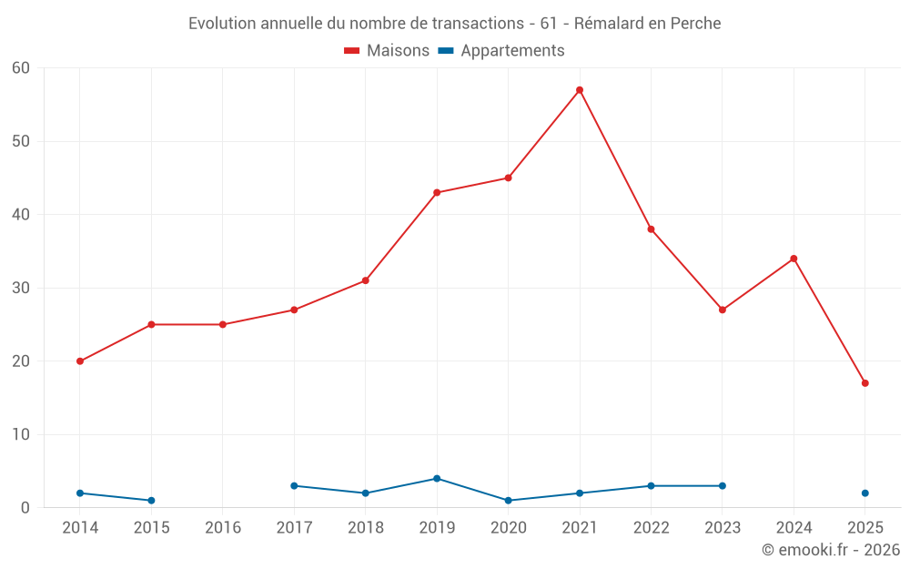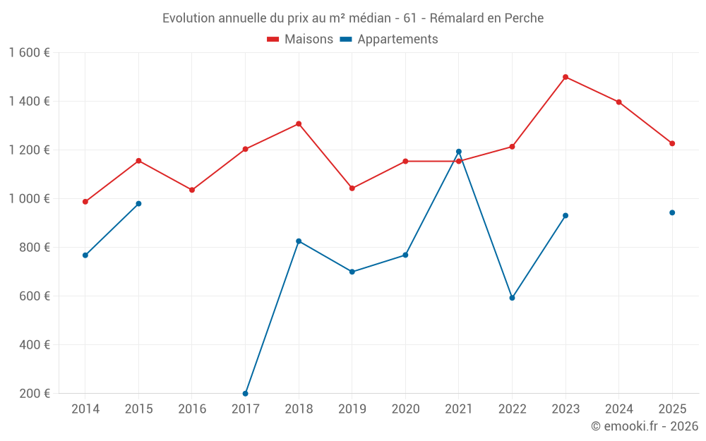Le prix médian sur les 36 transactions de maisons des 12 derniers mois dans la commune de Rémalard en Perche était de 1 364 € par mètre carré pour une valeur foncière médiane de 100 005 €. Sur cette période 60% des transactions se sont situées entre 809 et 1 842 € par mètre carré (du 2ème au 8ème déciles).