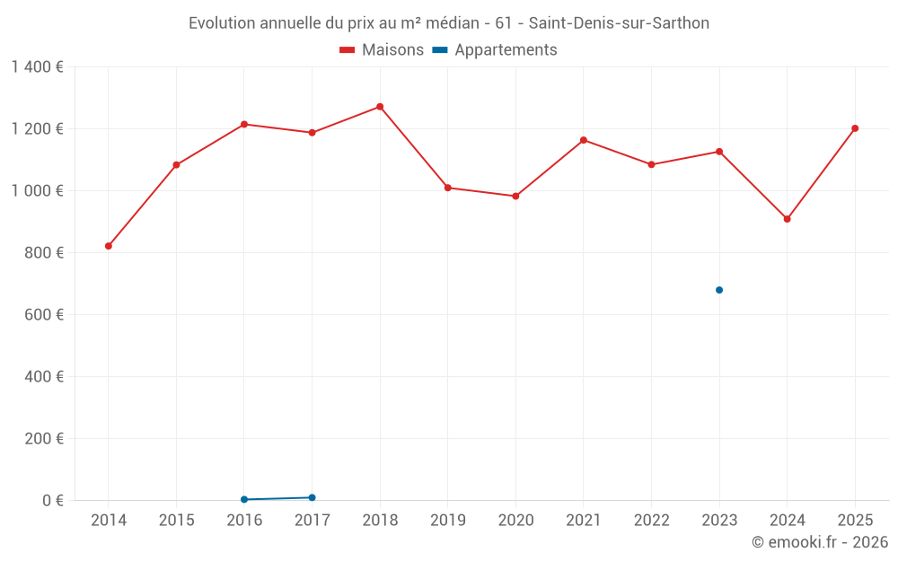 Le prix médian sur les 16 transactions de maisons des 24 derniers mois dans la commune de Saint-Denis-sur-Sarthon était de 958 € par mètre carré pour une valeur foncière médiane de 95 000 €. Sur cette période 60% des transactions se sont situées entre 763 et 1 290 € par mètre carré (du 2ème au 8ème déciles).